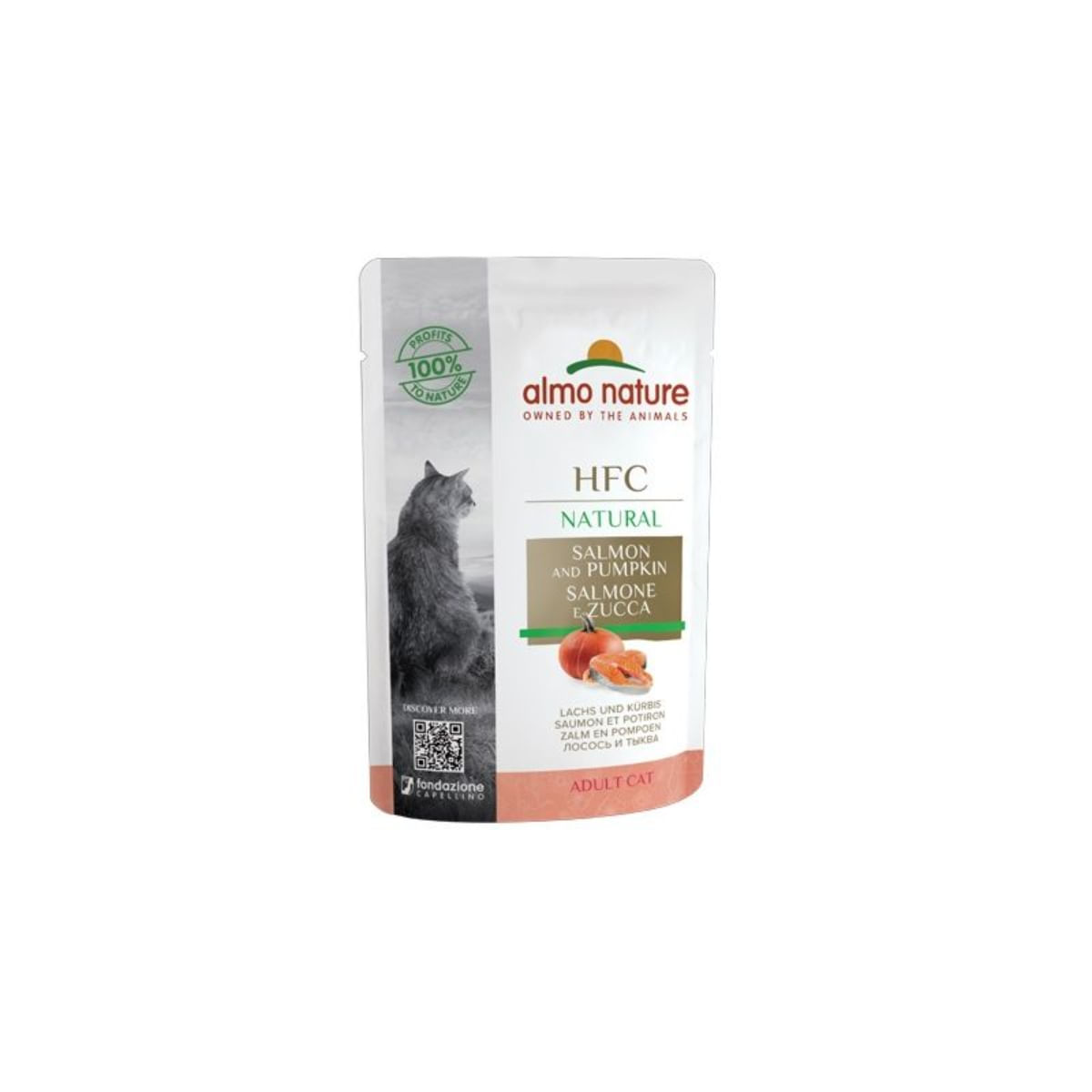 ALMO NATURE HFC, Somon si dovleac este o alegere delicioasa pentru pisica ta! Cu ingrediente naturale si o combinatie savuroasa de somon si dovleac, acest plic de hrana umeda va face ca fiecare masa sa fie o experienta placuta pentru micutul tau prieten.