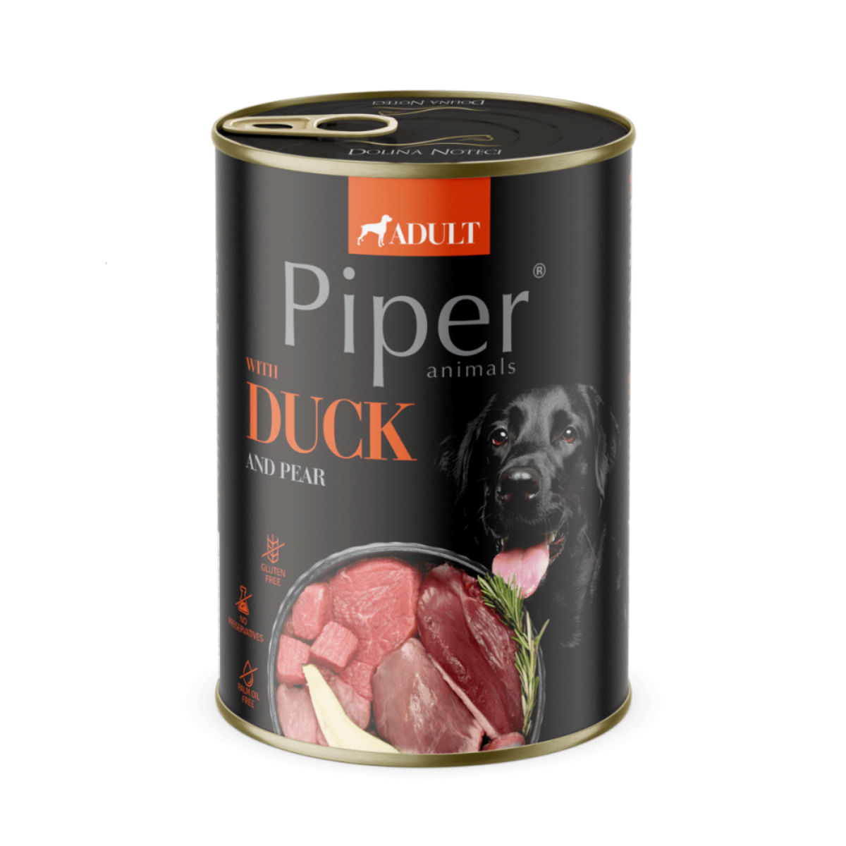 Rasfata-ti catelul cu Conserva pentru caini Piper Adult cu rata si pere, o delicatesa plina de nutrienti si arome naturale. Aceasta conserva este perfecta pentru a oferi o masa echilibrata si gustoasa, fara aditivi artificiali.