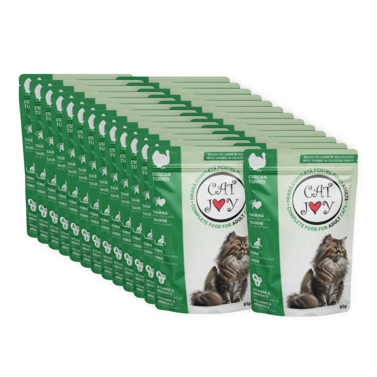 CAT JOY Curcan este un produs de hrana umeda de inalta calitate, special creat pentru pisici. Fiecare plic de 85g contine carne de curcan delicata si suculenta, preparata intr-un sos gustos, care va incanta chiar si cele mai pretentioase feline. Aceasta hrana este ambalata convenabil in baxuri de 24 de plicuri, asigurandu-ti o solutie practica si economica pentru alimentatia pisicii tale. Formula sa echilibrata ajuta la mentinerea unei diete sanatoase, fiind bogata in proteine esentiale, necesare pentru energia si vitalitatea pisicii tale.