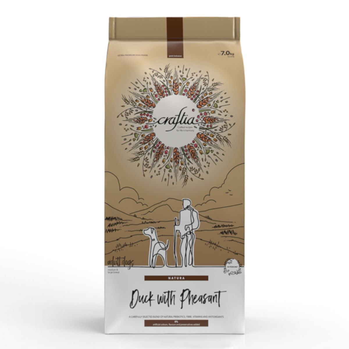 HRANA CRAFTIA Natura pentru caini este alegerea perfecta pentru a oferi cateilor tai o dieta sanatoasa si delicioasa. Cu ingrediente de calitate, precum rata si fazan, aceasta hrana uscata va incanta papilele gustative ale prietenului tau patruped si il va ajuta sa ramana energic si fericit.