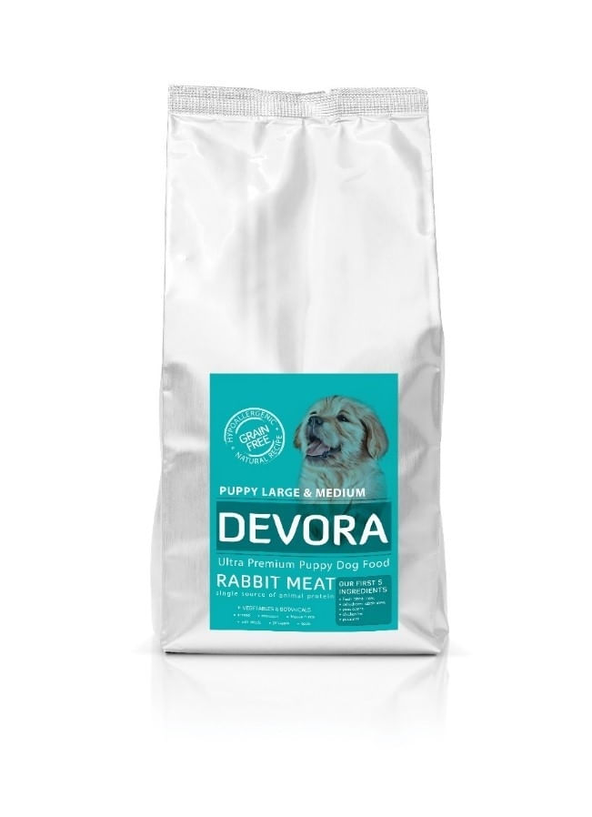Devora Grain Free Puppy Large si Medium cu Iepure este un aliment special conceput pentru puii de caine din rase mari si medii. Aceasta hrana ofera toate nutrientii esentiali necesari pentru o dezvoltare sanatoasa si armonioasa, avand la baza carne de iepure, o sursa de proteine de inalta calitate, usor digerabila. Fara cereale, aceasta formula este ideala pentru cateii care pot avea sensibilitati alimentare, asigurandu-le o digestie usoara si o energie de lunga durata. Produsul contine ingrediente naturale, fara aditivi artificiali, pentru a oferi un gust autentic si nutritiv. Fiecare pachet de 4 kg este perfect pentru a satisface nevoile energetice ale puilor in crestere.