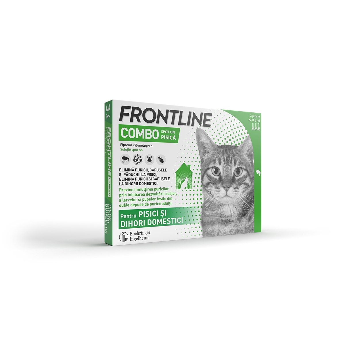 FRONTLINE Combo este solutia ideala pentru a proteja pisica ta de paraziti neplacuti. Cu 3 pipete usor de utilizat, acest produs ofera o protectie eficienta si de lunga durata, astfel incat tu si pisica ta sa va puteti bucura de momente frumoase impreuna, fara griji.