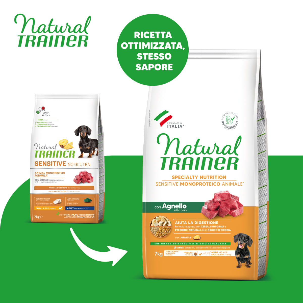 NATURAL TRAINER Speciality Nutrition Sensitive este alegerea ideala pentru cainii cu un sistem digestiv sensibil. Cu un continut monoproteic de miel, aceasta hrana uscata le ofera nutrientii necesari intr-o formula usor digerabila, astfel incat patrupedul tau sa se bucure de fiecare masa.