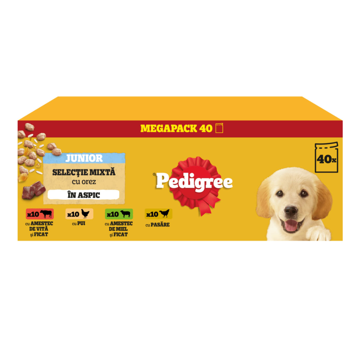 PEDIGREE Junior Selectie Mixta cu Orez, XS-XL, Pasare si Vita, plic hrana umeda caini junior, (in aspic), megapack, 100g x 40buc