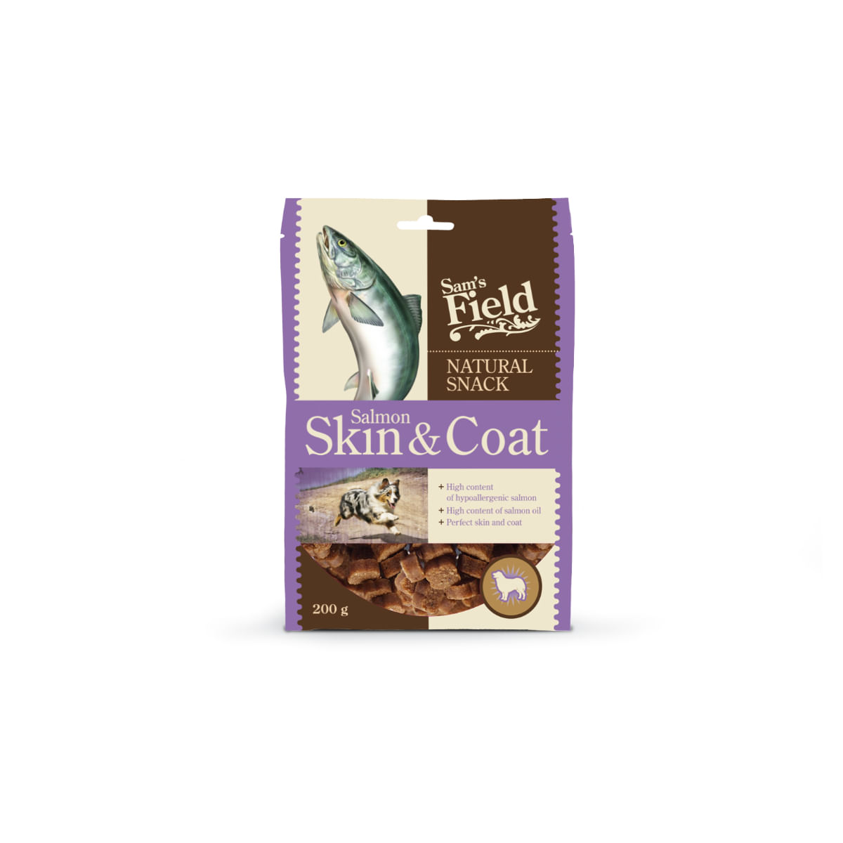SAM'S FIELD Natural Snack Skin & Coat, XS-XL, Somon, punguta recompense caini, piele & blana, 200g